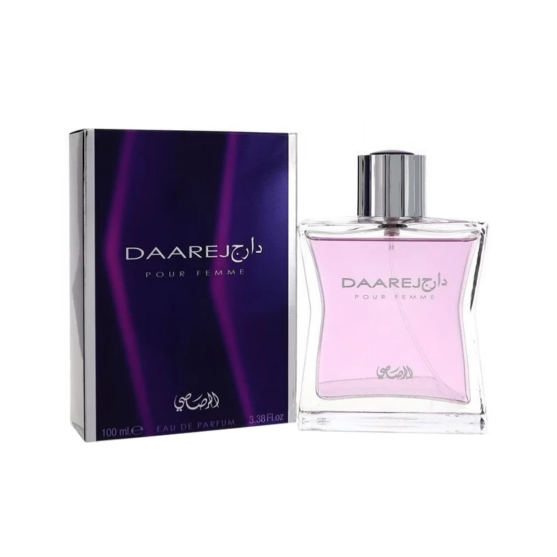 Daarej pour Femme de Rasasi es una fragancia de la familia olfativa Floral Frutal Gourmand para Mujeres. Las Notas de Salida son durazno (melocotón), notas verdes, naranja y bergamota; las Notas de Corazón son heliotropo, orquídea, nardos, jazmín y lirio de los valles (muguete); las Notas de Fondo son caramelo, almizcle, vetiver, sándalo, ámbar y pachulí.