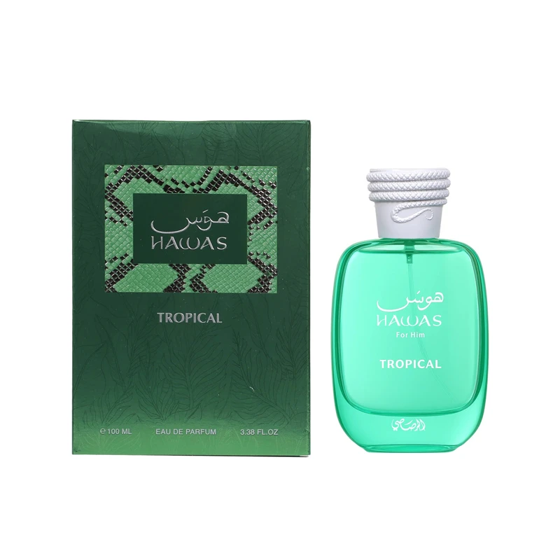 Hawas Tropical de Rasasi es una fragancia de la familia olfativa Aromática Verde para Hombres. Esta fragrancia es nueva. Hawas Tropical se lanzó en 2025. Las Notas de Salida son Agua de coco, hojas de higuera y jengibre; las Notas de Corazón son coco, higo y menta; las Notas de Fondo son sándalo, haba tonka y almizcle.
